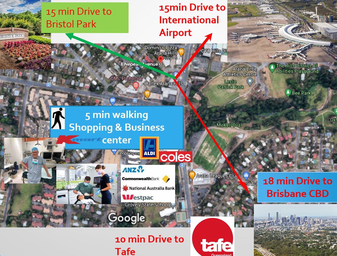 The local shopping center called Arana Hills Plaza has almost everything you could need like Large Hypermarket and department stores like Coles, Aldi, Kmart and a few famous brands. You can also find one of the quieter and major shopping complexes nearby at Brookside.